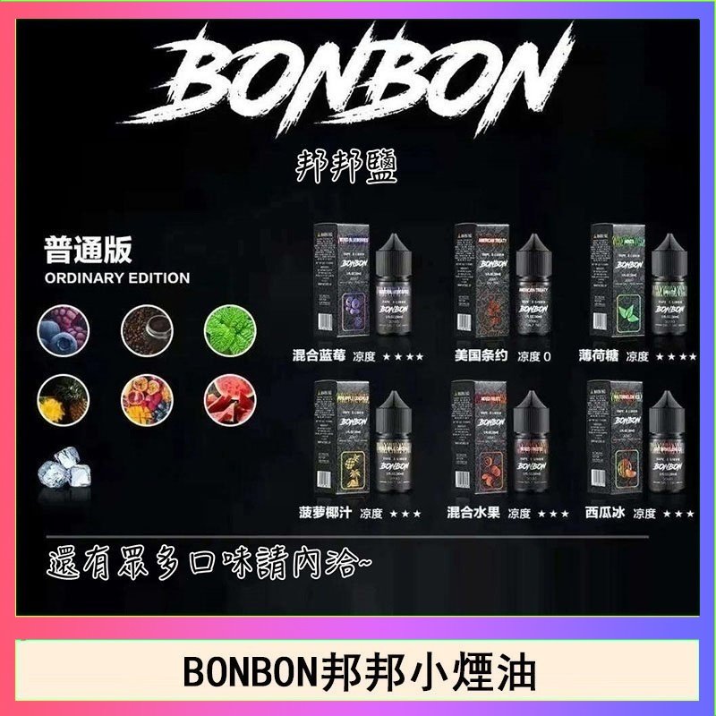 口味: 西柚 红冰 山楂 混合水果 惡魔之吻 薄荷糖 菠萝椰汁 西瓜冰 莓果廚師 混合蓝莓 法式檸檬派 今夜無飲 小芒芒 七星菸草薄荷 黑牌煙草 王牌煙草 曲奇煙草 黑標五木煙草 小綠人