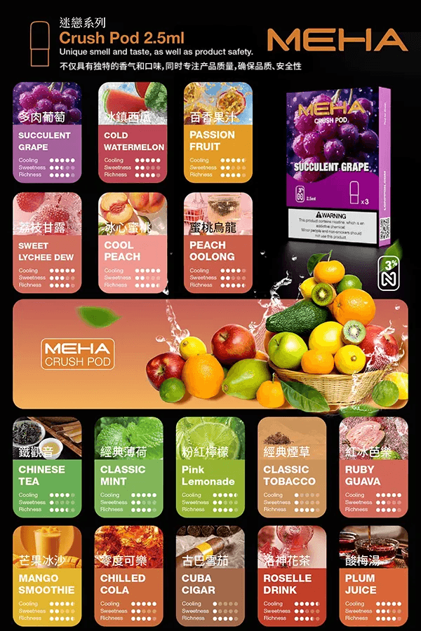 Meha 煙彈的Crush系列提供 16 種精緻口味選擇,一次滿足你的所有渴望: